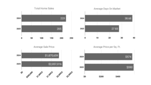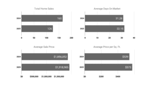 The Lexington real estate market remained strong in 2025, showing notable growth in property values despite a slight decrease in sales volume. The number of sales fell by 8.07%, from 223 to 205, suggesting a modest slowdown in activity. However, demand remained robust, as reflected in the average sale price climbing 9.67% to $2,057,016 and the average price per square foot increasing 2.79% to $590. Perhaps the most striking change was the significant drop in average days on market (DOM) by 28.05%, from 38.68 to 27.83 days, indicating that homes sold much faster than the previous year. Overall, Lexington’s 2025 market reflects strong buyer demand and rising home values, even amid slightly fewer transactions.