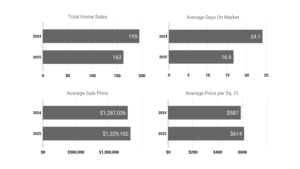 Meanwhile, Arlington’s real estate market in 2025 demonstrated continued strength and rising home values despite a slowdown in overall sales activity. The number of sales declined by 16.41%, from 195 to 163, pointing to reduced inventory or a more competitive market. Even so, the average sale price rose 3.27% to $1,329,102, and the average price per square foot increased 4.60% to $614, signaling sustained buyer demand and appreciating property values. Homes also sold much more quickly, with the average days on market (DOM) dropping significantly by 31.12% from 24.1 to just 16.6 days. Overall, Arlington’s 2025 market was characterized by faster sales and steady price growth, reflecting strong demand despite fewer transactions.